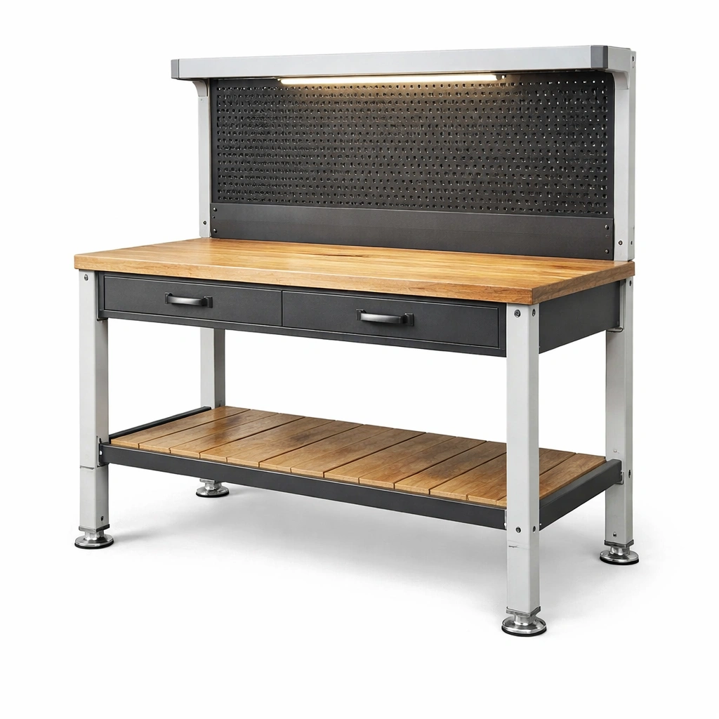 Banco de trabajo de madera y metal con estante