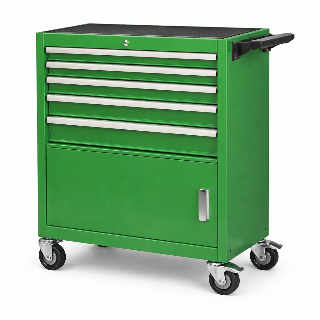 Carro de herramientas de metal verde con cajones y puerta