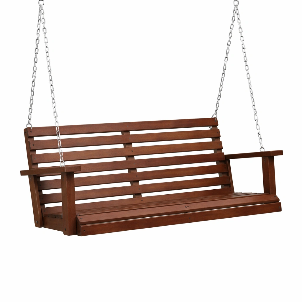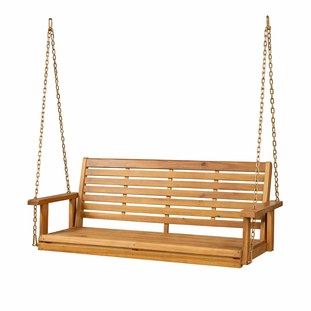 Columpio de porche de madera marrón con cadenas de acero galvanizado